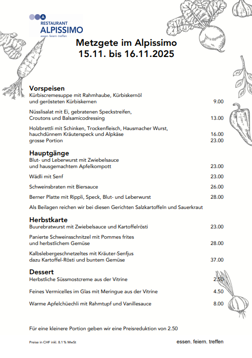 Das Restaurant Alpissimo lädt zu einer Metzgete ein. Alte Klassiker und moderne Gerichte werden am Wochenende vom 15. und 16. November 2025 von jeweils 11.00 Uhr bis 13.30 Uhr angeboten. Würste, Speck, Rippli und Zunge gehören neben anderen Köstlichkeiten zu einer richtigen Metzgete dazu.